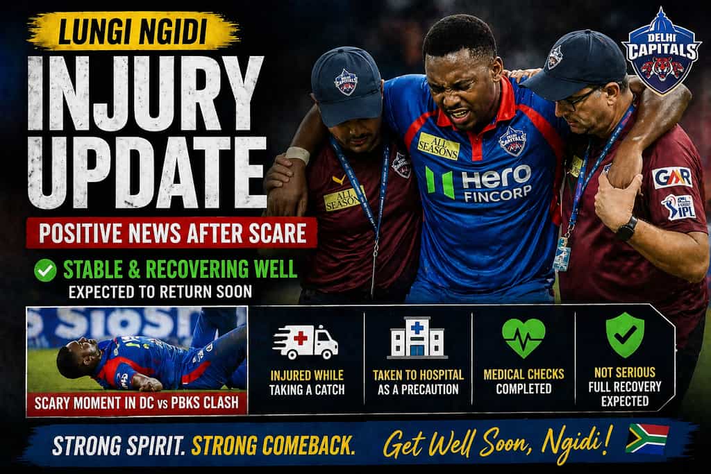 The Lungi Ngidi injury update comes after a frightening moment during the IPL 2026 clash between Delhi Capitals and Punjab Kings.